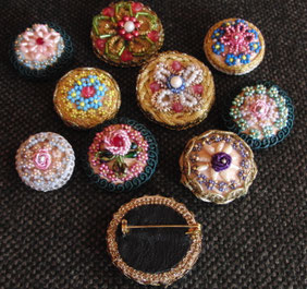 In diesem Kurs wird mit Borten und feinem Draht gearbeitet. Dazu nehmen wir echte Perlen, Glasperlen, Glasstifte und Kristallsteine. Diese werden zu Sternen, Blümchen und Blättern geformt und auf eine Holzscheibe oder Platine montiert. Mit Gold- oder Silberborte wird der Rand verbrämt und die Rückseite der Montage mit Leder verdeckt.
