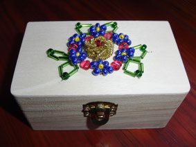 Am Ende des Kurses kann man die eigenen Werke auf einem Holzkästchen oder einer Spanschachtel montieren. Als Geschenk oder als Erinnerung oder Anleitung für spätere Werke daheim.